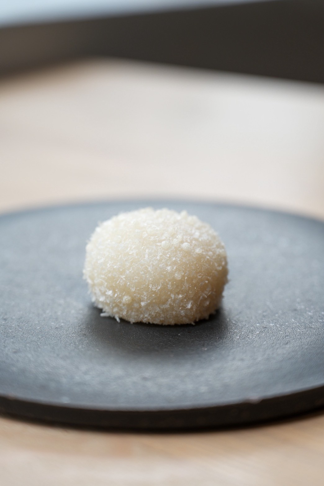白練りごま入り白あんの道明寺にライスパフと氷餅をまぶしました。