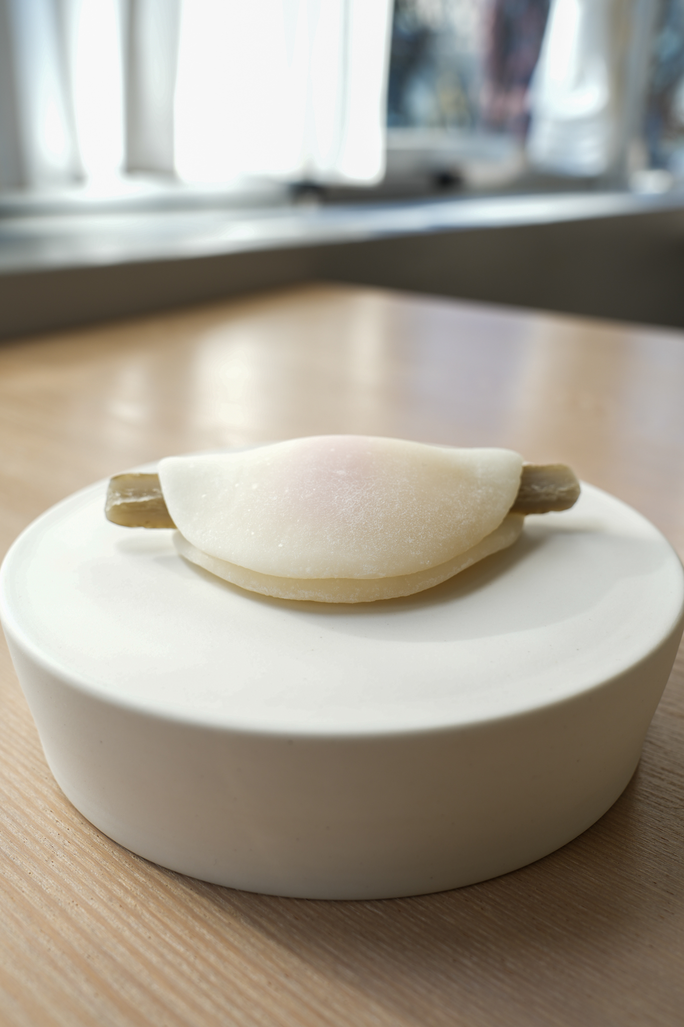 クチナシの黄色とビーツの紅で明らかになっていく想いをカタチにいたしました。クランベリーとレモンピール入りの白餡、こなし製。
